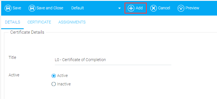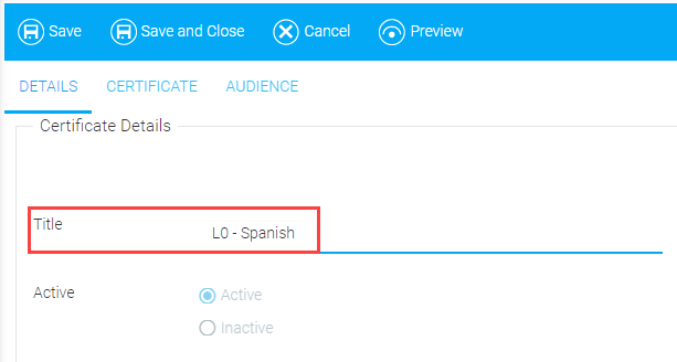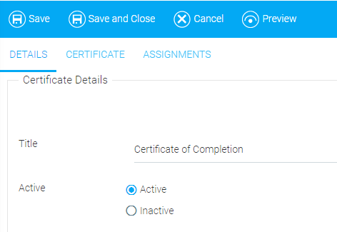 On the Details tab, add a title and select either the Active or Inactive radio button. If the certificate you are creating is not finished, you can select Inactive and save the certificate for later.
