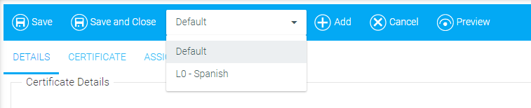 In the event that you need to create a copy of a certificate of completion in an additional language, open the certificate of completion and click the Add button in the top toolbar.
