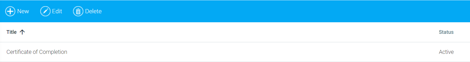 The main screen will open, listing all existing certificates. To edit an existing certificate, select the title in this list and click the Edit button in the toolbar. To create a new certificate, click the New button in the toolbar. To Delete an existing certificate, click the Delete button.