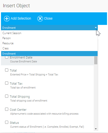 This will open the Insert Object pop-out box. Select a category from the drop-down menu, and select the fields you wish to insert. For certificates of completion, you should mostly use the selections from the Enrollment category so that values from the enrollment show properly on the certificate of completion. Click on the chosen field, then click the Add Selection button. Repeat until you are finished making selections. Your selections will appear in the Rich Text Editor at the point where your cursor was located.