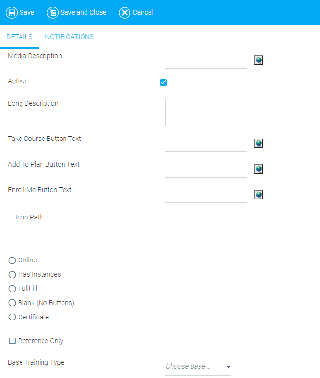 NOTE: Be sure to check the Active box if you wish to make this media type visible in the LMS.